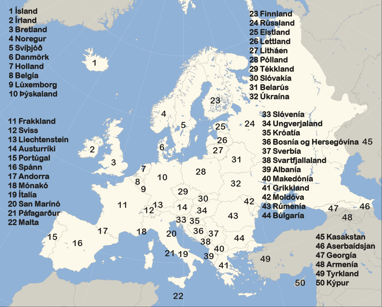 - Kort: Blank political map of Europe (polar stereographic projection) cropped.svg. Wikimedia Commons. Texti settur inn af ritstjórn Vísindavefsins. https://commons.wikimedia.org/wiki/File:Blank_political_map_of_Europe_(polar_stereographic_projection)_cropped.svg