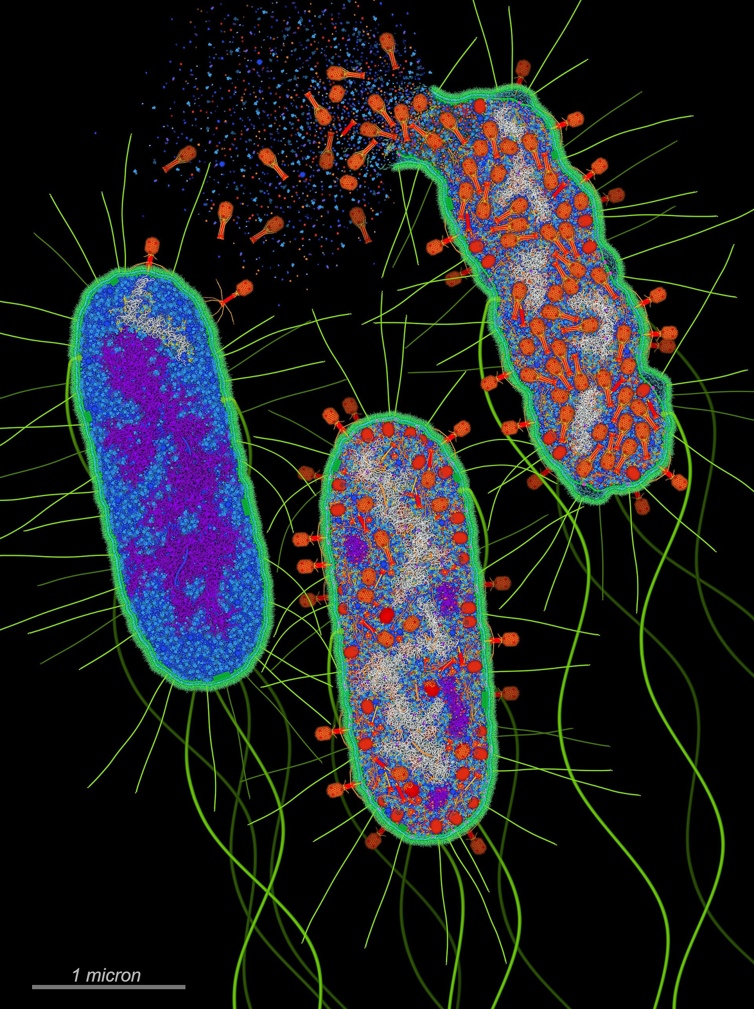 Bakteríufagar (veirur, rauðar á mynd) sýkja bakteríur. Stærðarhlutföllin milli veira sem sýkja bakteríur og bakteríanna eru talsvert frábrugðin því sem við þurfum að venjast.