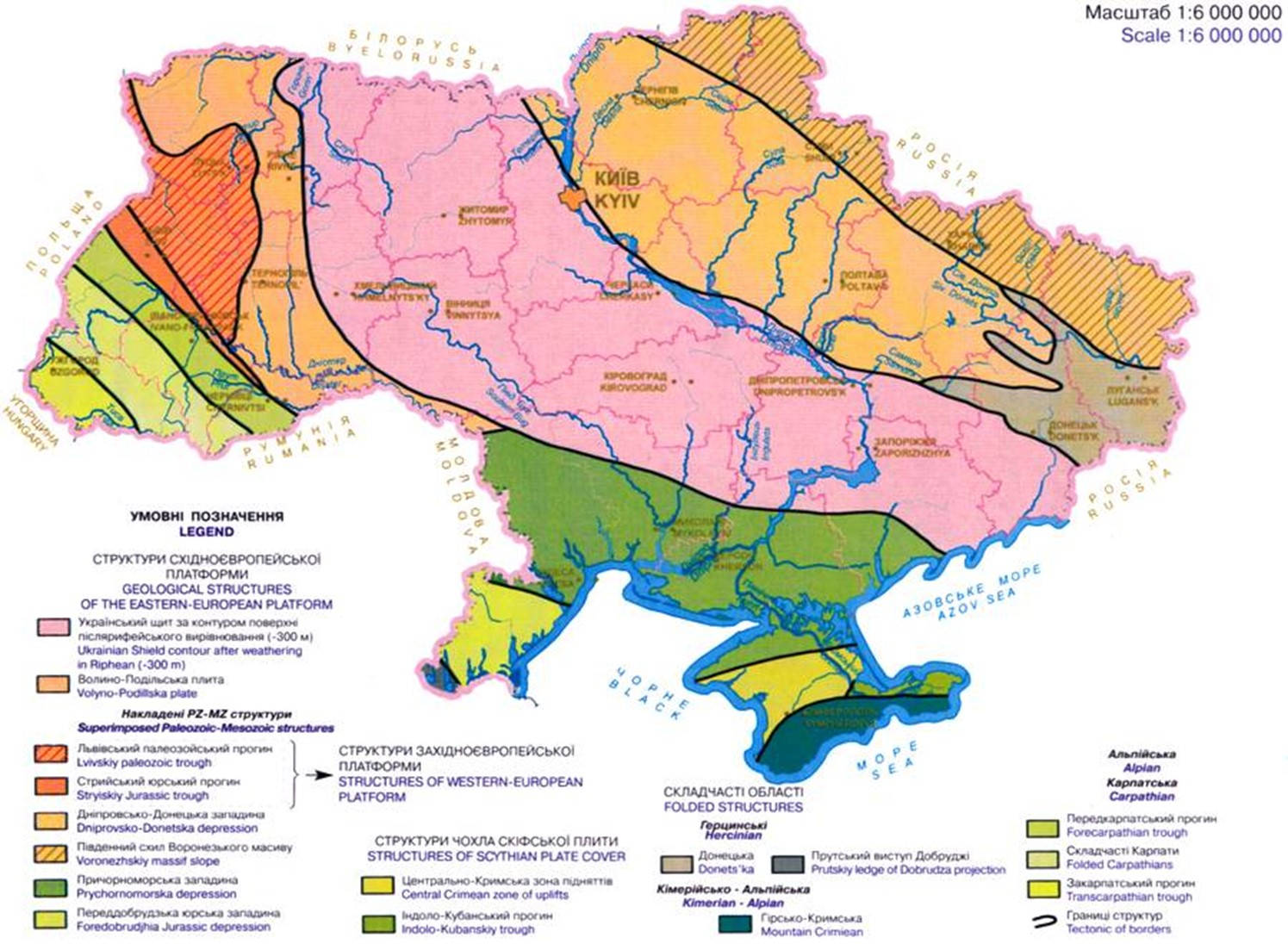 Úkraína, sex sinnum stærri en Ísland að flatarmáli, er 95% flatlendi, hluti af steppunni miklu sem teygir sig frá Norðursjó í vestri allt austur að Úralfjöllum. Fjalllendi er í Úkraínu aðeins að finna í Karpatafjöllum, sem SV-horn landsins nær til, og á Krímskaga í suðri – hvort tveggja hluti af Alpafellingunni. Samkvæmt kortinu tilheyrir syðsti hluti Krímaskaga Harz (Hercynian) fellingunni, sjá síðar. Berggrunnur Úkraínu spannar alla jarðsöguna, frá upphafsöld til nútíma; þar koma saman brot af hinum forna meginlandskjarna Evrasíuflekans, setfylltar dældir og yngri jarðlagafellingar.