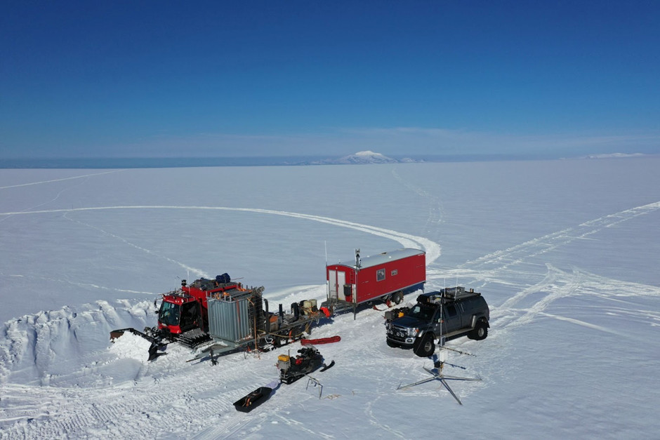 2. mynd. Útgerð Landsvirkjunar og Jarðvísindastofnunar Háskólans við afkomumælingar vorið 2019. Búið er að setja upp búðir ofarlega á Brúarjökli. Í baksýn má sjá Snæfell bera við himinn. Snjóbíll dregur „afkomulestina“ sem flytur eldsneyti, mælitæki og annan búnað sem þarf til verkefnisins. Rauður vagn er meiðhýsi sem leiðangursfólk hefur búsetu í meðan á verkefninu stendur og gjarnan kallað „jökla-svítan“. Auk þess eru bílar og vélsleðar algengur búnaður við verkin sem unnin eru.
