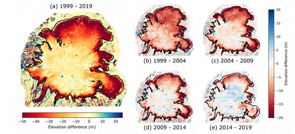 4. mynd. Dæmi um landlíkanafkomu fyrir Mýrdalsjökul fyrir mismunandi tímabil. Myndirnar draga fram hæðarbreytingar milli tímabilana sem túlka má sem rúmmálsbreytingar jökulsins. Myndin er fengin úr Bernat o.fl. 2023.