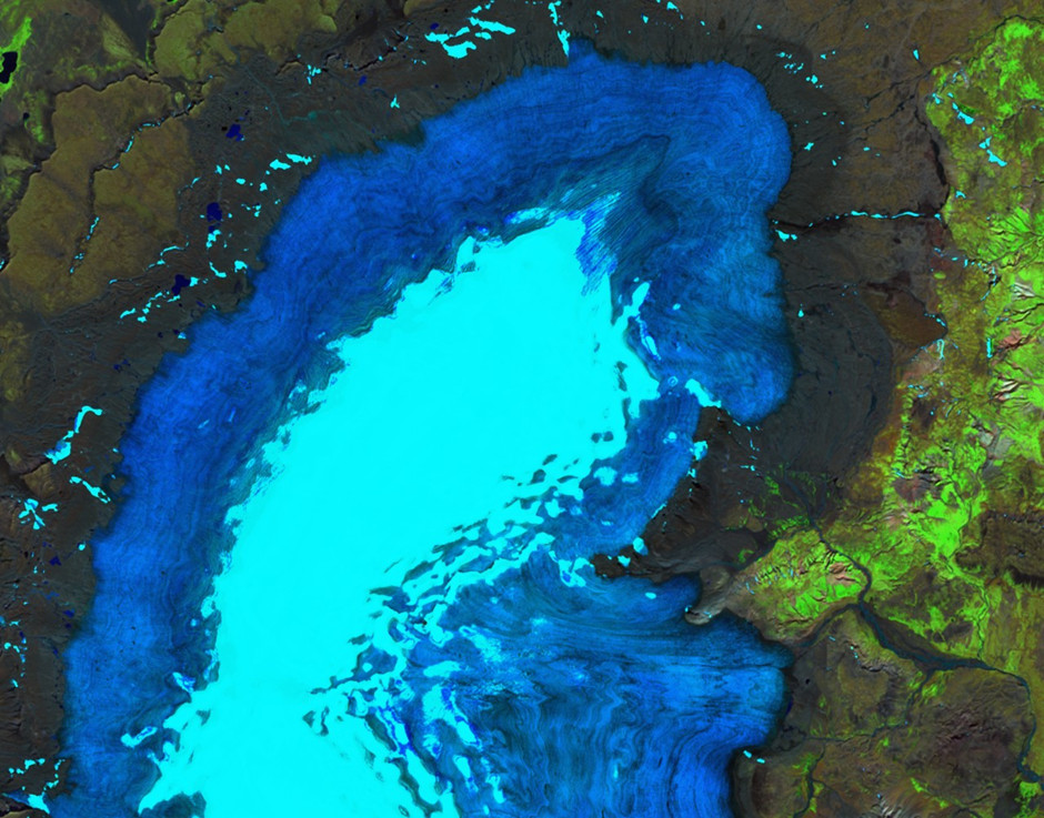 1. mynd. Norðurhluti Langjökuls í ágúst 2025. Greinileg skil má sjá milli safnsvæðis (ljósbláir litir) þar sem snjór og hjarn eru á yfirborðinu og leysingarsvæðis (dekkri litir) þar sem jökulís er kominn undan vetrarsnjónum. Skil þessara svæða er snjólína jökulsins sem má nálga sem jafnvægislínu hans að hausti. Myndin er tekin af SENTINEL-2 gervitungli Copernicus EU.