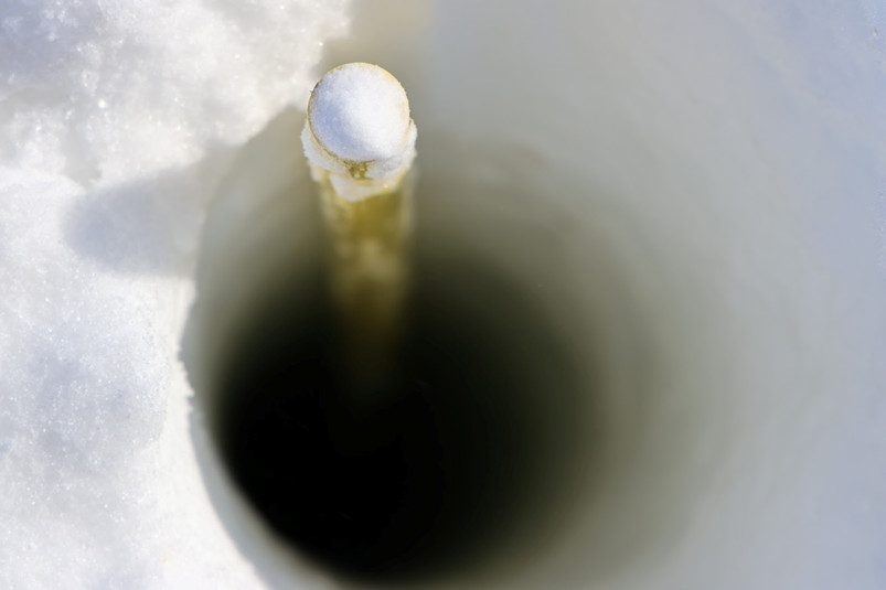 3. mynd. Stikutoppur í 6 m djúpri kjarnaholu að vori. Að hausti hefur stikan bráðnað „upp úr“ holunni, sem lýsir sumarleysingunni.