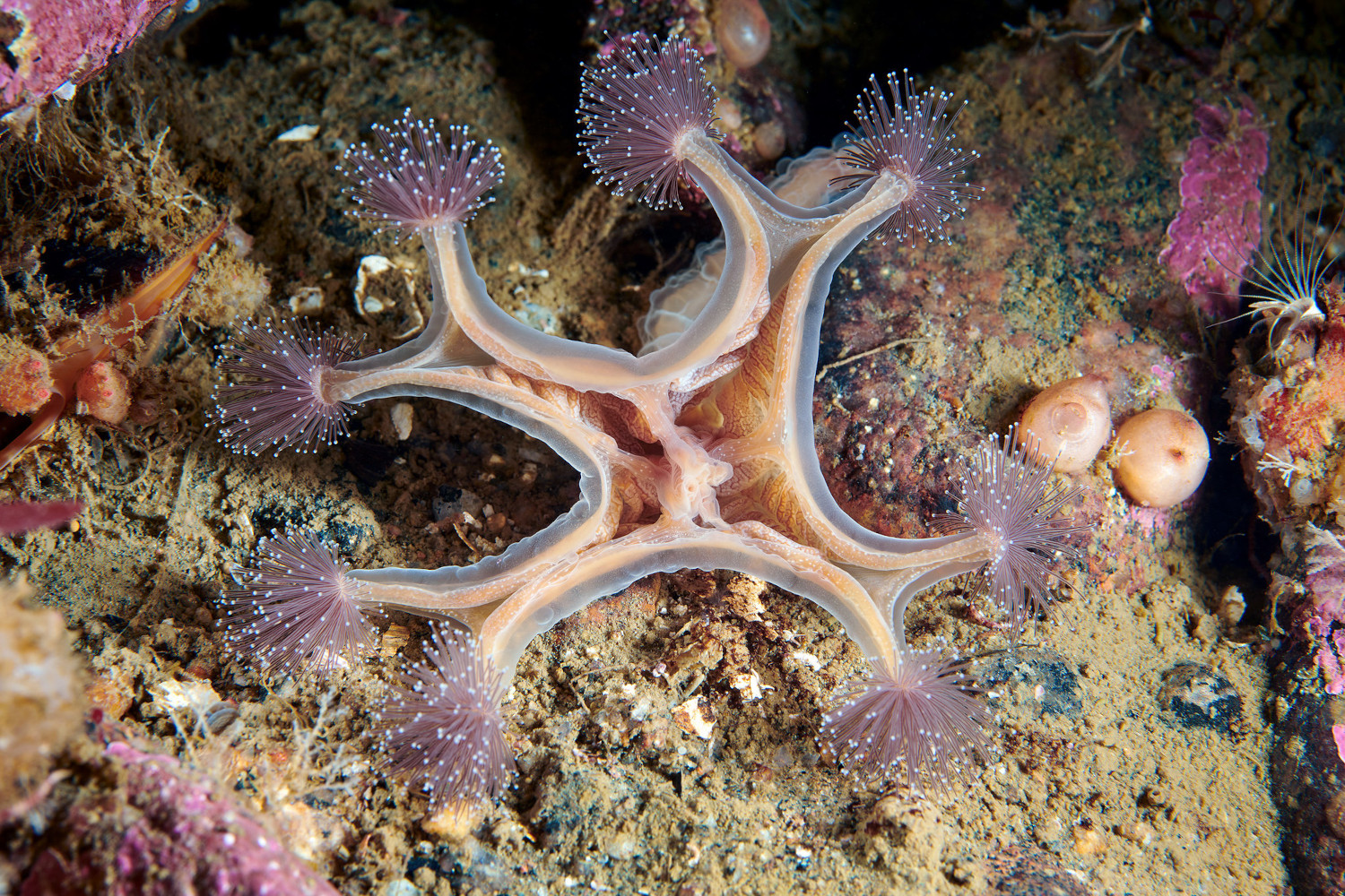 Hveldýr af tegundinni Tubularia indivisa. Tegundin lifir í köldum sjó, dýrin eru holsepar sem mynda sambýli og minna nokkuð á blóm. Mynd tekin á 22 m dýpi við vesturströnd Noregs.